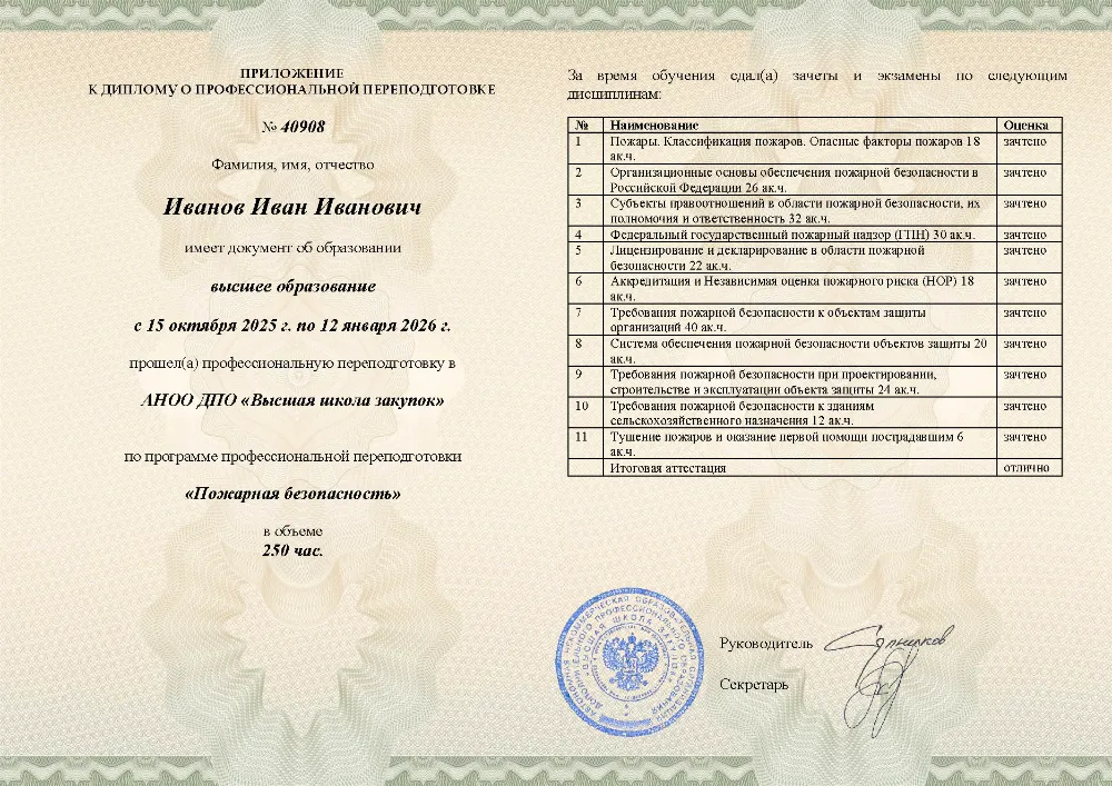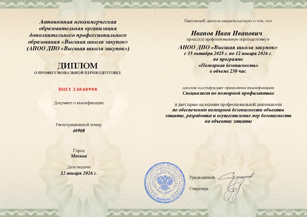 Профессиональная переподготовка, 250 академических часов, 11 модулей: организационные основы и законодательство в области пожарной безопасности, лицензирование и надзор, требования к объектам защиты, проектирование, тушение пожаров и оказание первой помощи пострадавшим. Онлайн-обучение в в Твери с итоговой аттестацией.