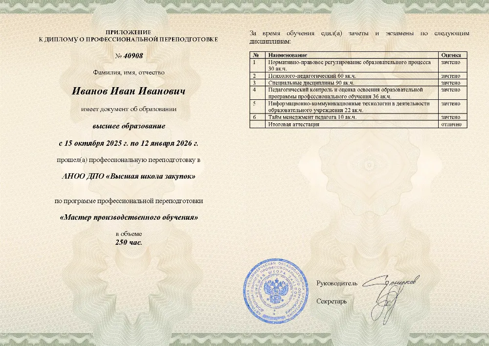 Профессиональная переподготовка, 250 академических часов, 11 модулей: нормативно-правовое обеспечение, основы педагогики и психологии, проектирование образовательных программ, методика профессионального обучения, педагогический контроль, применение ИКТ и тайм-менеджмент педагога. Онлайн-обучение в в Твери с итоговой аттестацией.